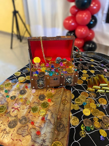 A box of treasure as part of scavenger hunt décor for kid’s party at BirthdayLand